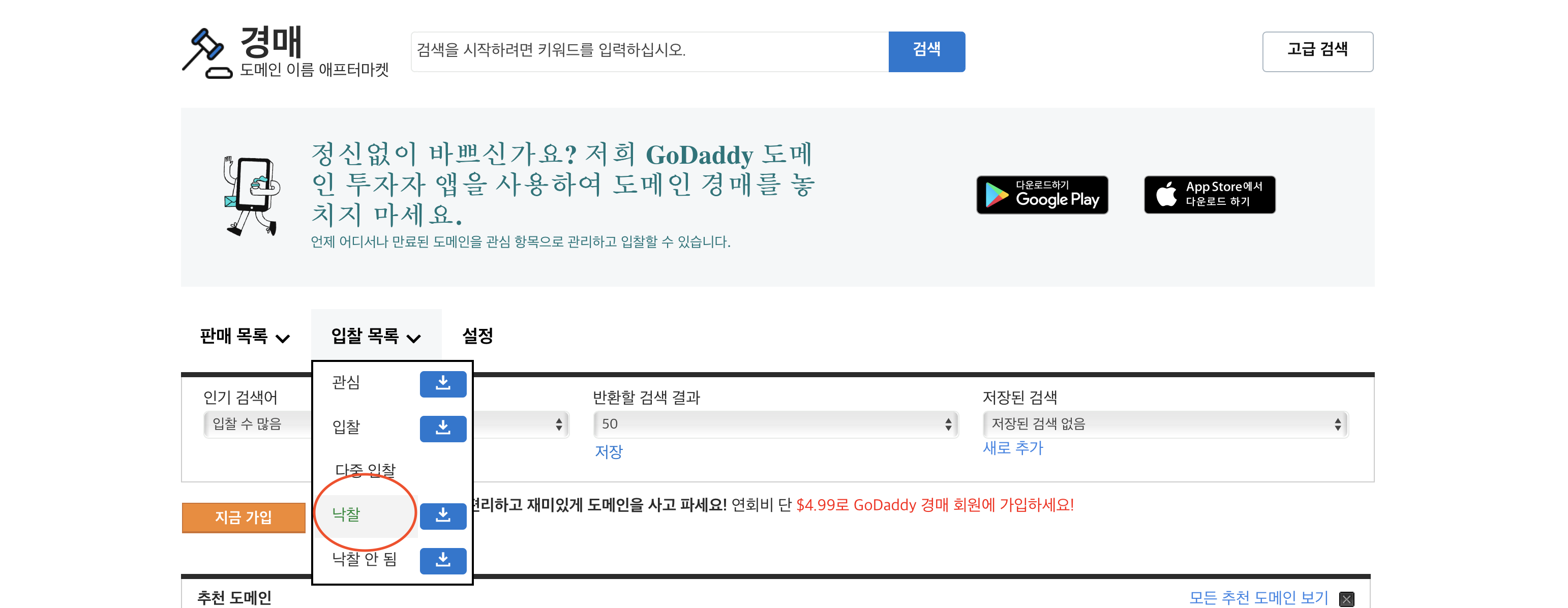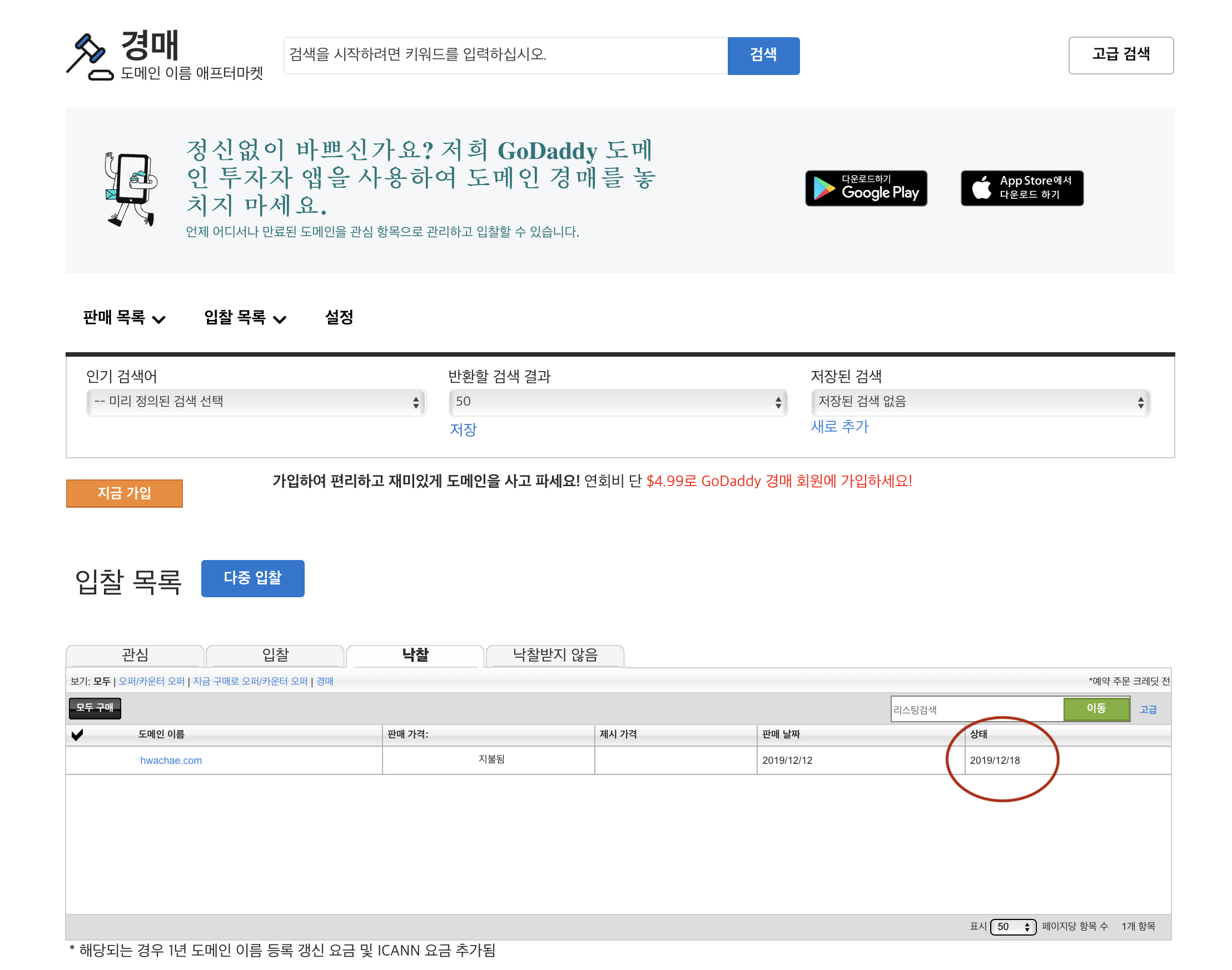 고대디 옥션 사이트에서 로그인 후 입찰 목록안에 낙찰에 보면 자신이 구입한 도메인의 정보가 있습니다.