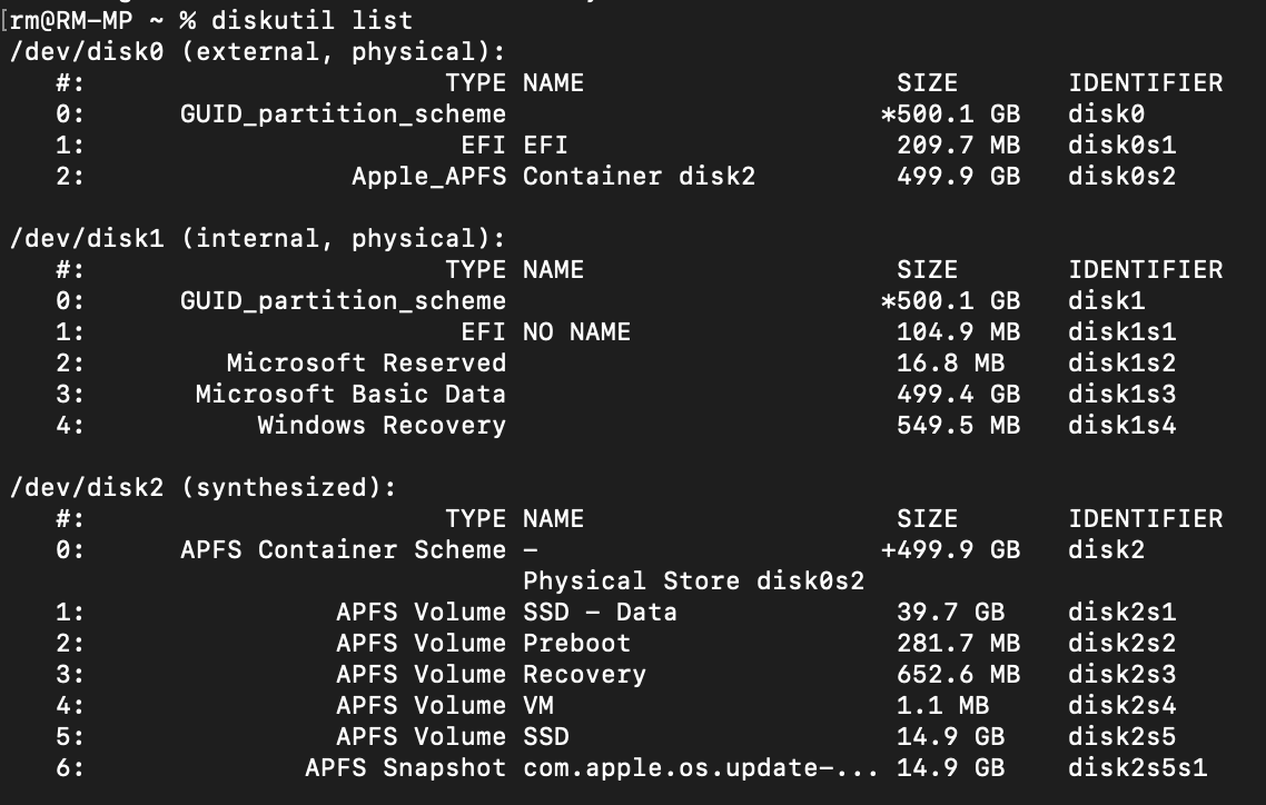 그러면 위와 같이 전체 디스크 내용을 볼 수 있습니다. 제 경우에는 disk1은 윈도우이므로 무시하시고 disk0 가 우리가 macOS를 설치한 디스크입니다.