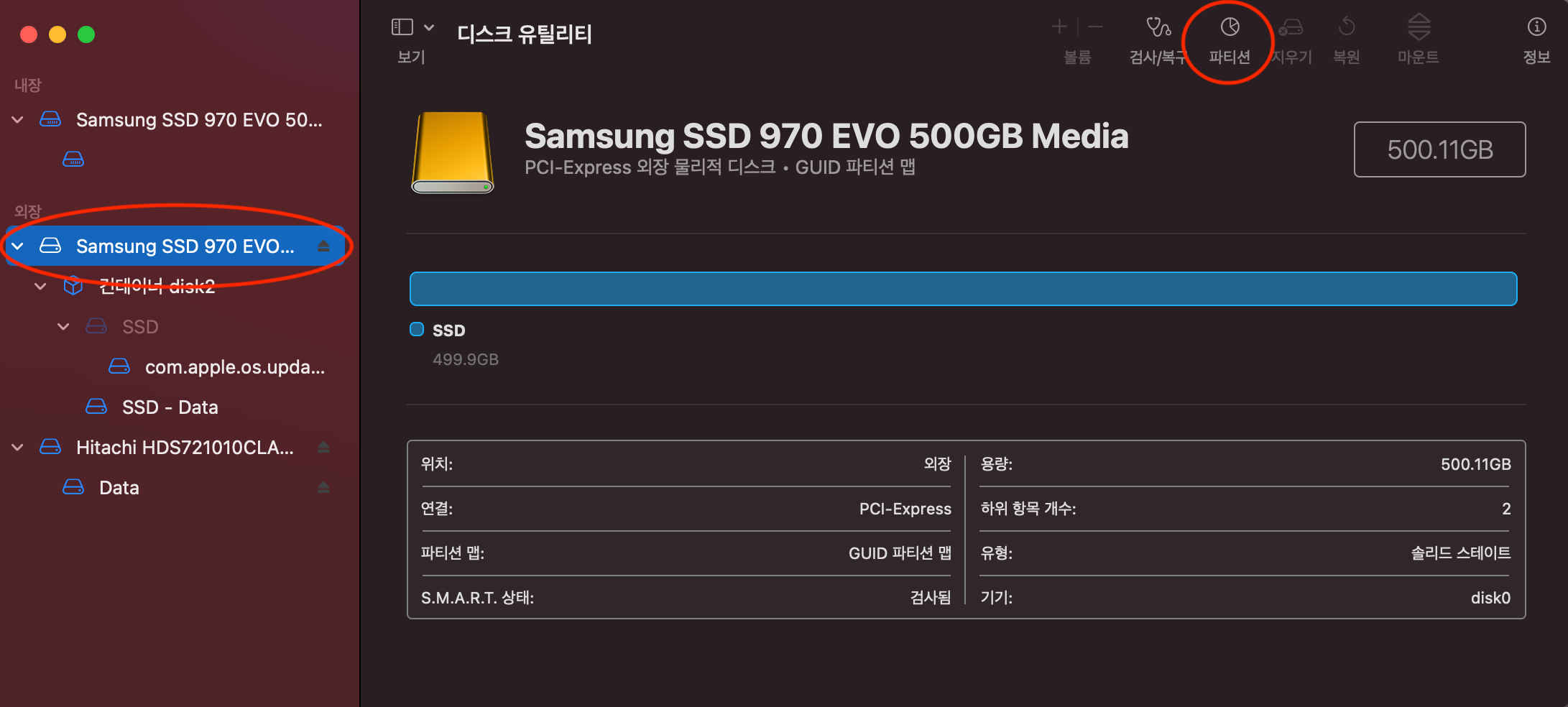 디스크 유틸리티를 실행합니다. 맥이 설치되어있는 디스크(볼륨 X)를 선택하고 파티션을 만듭니다.