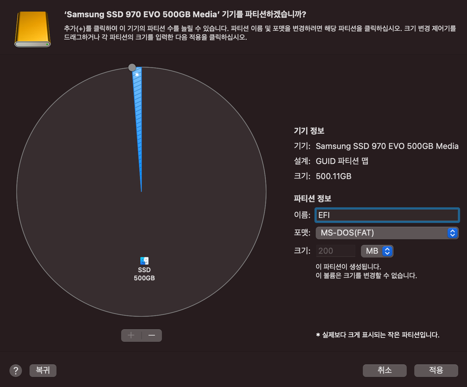 파티션은 이름 EFI에 ms-dos 포멧, 200mb 크기로 만들어줍니다.